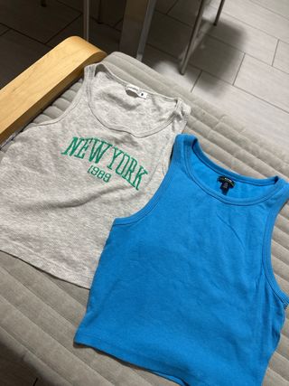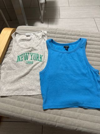 Due top in taglia S, uno grigio con stampa New York 1989 e uno blu. - Top grigio con scritta New York 1989 - Top blu tinta unita