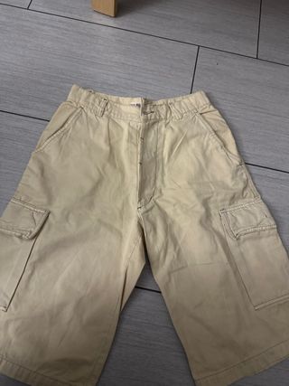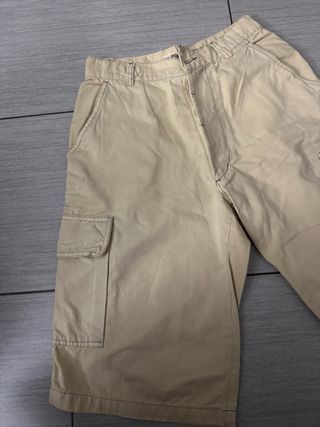 Pantaloni cargo in tessuto color beige, modello cargo. - Tasche laterali applicate. - Chiusura con bottone e zip. - Passanti per cintura.