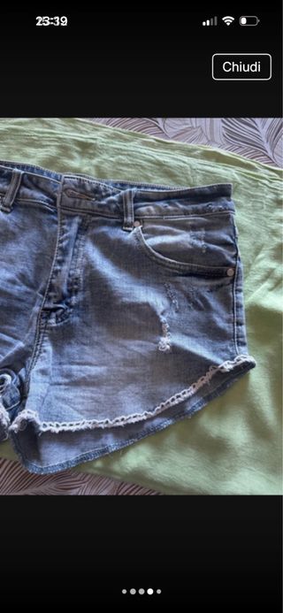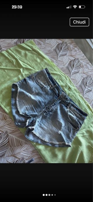 Shorts in jeans da donna, modello esse. - Taglio corto - Dettagli strappati - Orlo in pizzo