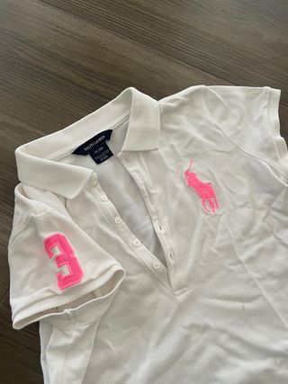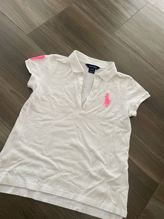 Maglietta polo da bambina Ralph Lauren. Un capo classico e versatile. - Colore bianco con logo pony rosa. - Dettaglio logo rosa sulla manica. - Collo a polo con bottoncini.