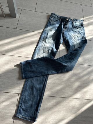 Jeans da donna a vita bassa con un design strappato e moderno. - Tessuto denim leggero. - Dettagli strappati sulle gambe. - Chiusura con zip e bottone.