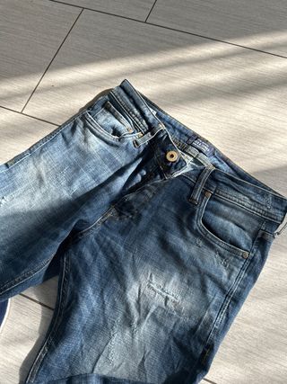 Jeans da uomo J&J in denim blu. Presentano un design con strappi e un lavaggio che conferisce un aspetto vissuto. - Modello con chiusura a bottoni. - Dettagli strappati sulle gambe. - Effetto lavato e invecchiato.