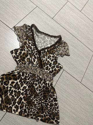 Maglia da donna con una vivace fantasia leopardata. - Scollo a V con bordino. - Maniche corte. - Elastico in vita per una vestibilità comoda.