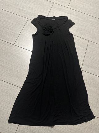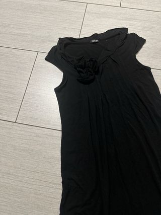 Elegante abito nero con un dettaglio floreale sul collo. - Maniche corte. - Scollo morbido. - Tessuto leggero e fluido.