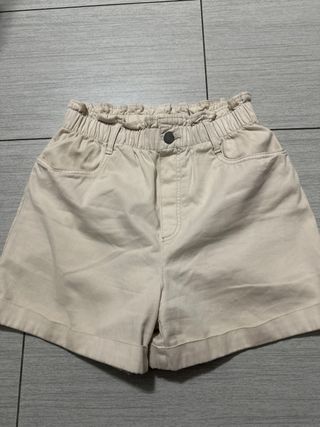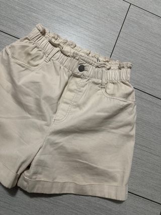 Pantaloncini da donna in vita alta. - Vita elasticizzata con arricciatura. - Chiusura con bottone e zip. - Tasche laterali. - Orlo risvoltato.