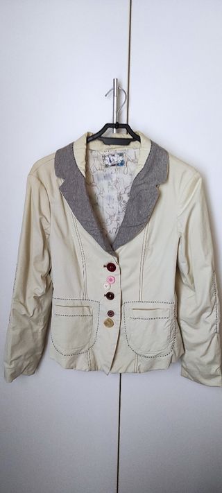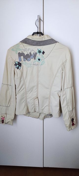 Bellissima giacca firmata Desigual, dal design unico e originale. Taglia italiana 38 ( veste xs) - Modello corto. - Collo con dettaglio in panno grigio. - Chiusura con bottoni multicolor. - Tasche applicate. - Dettagli a contrasto con cuciture decorative. - Stampa originale sul retro.