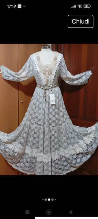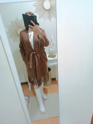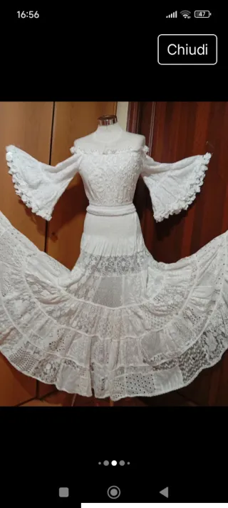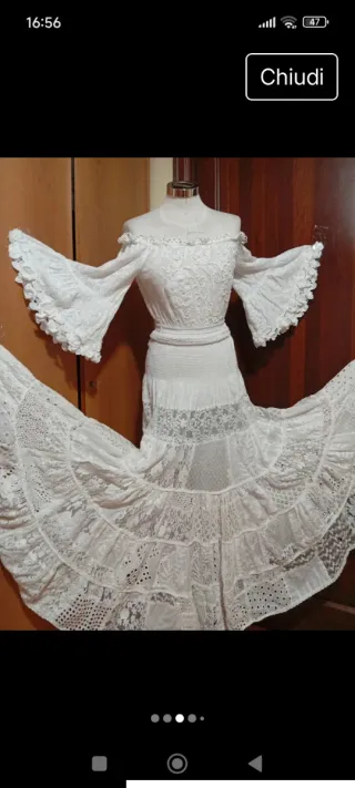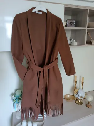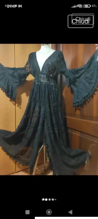 Elegante abito lungo con dettagli in pizzo e frange. - Maniche ampie e svasate. - Scollo a V profondo. - Orlo con frange decorative. - Tessuto in pizzo lavorato.