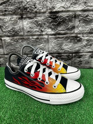 Scarpe Converse basse con un design unico a fiamme. - Tomaia in tela nera con stampa sfumata. - Dettagli rossi, arancioni e gialli. - Chiusura con lacci bianchi. - Suola in gomma bianca.