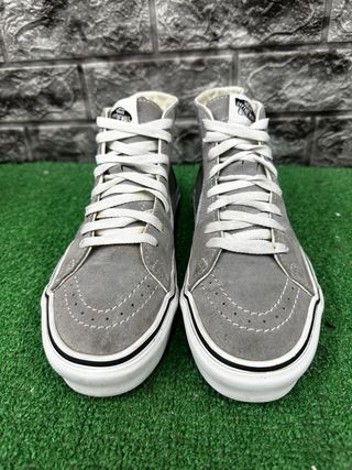 Scarpe Vans Sk8-Hi alte in tonalità grigie con dettagli bianchi. Perfette per un look casual. - Toma in scamosciato e tela. - Iconica banda laterale. - Suola in gomma vulcanizzata.