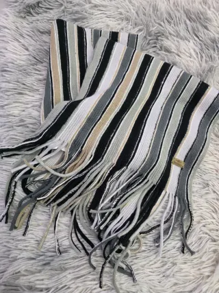 Sciarpa con un design a righe multicolore e dettagli con frange. Un accessorio versatile per completare il tuo look. - Design a righe verticali. - Orlo con frange. - Tessuto morbido al tatto.