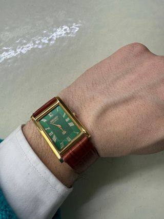 Vendo meraviglioso seiko tank vintage con quadrante verde smeraldo e cinturino in pelle color marrone, e cassa e dettagli in corazione oro. Le dimensioni della cassa sono 3.5x2.5cm L'orologio viene spedito senza scatola originale e senza garanzia. Ho sostituito il cinturino con un cinturino in pelle di nuova manifattura in quanto era molto consumato quello originale