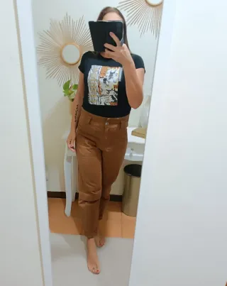 Pantaloni da donna in un bel color ruggine. - Vita alta con passanti per cintura. - Chiusura con bottone e zip. - Tasche frontali e posteriori. - Fondo gamba risvoltato. - Elastico in vita