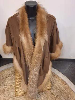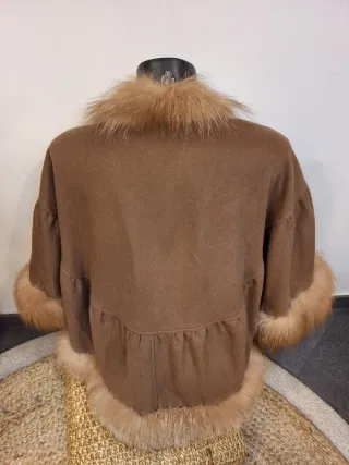 Elegante mantella con dettagli in pelliccia. - Morbido tessuto. - Bordi in pelliccia su collo e maniche. - Design avvolgente.