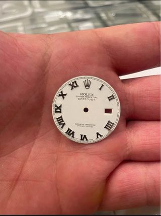 Quadrante originale Rolex Datejust. - Colore bianco con indici romani neri. - Logo Rolex e Superlative Chronometer Officially Certified stampati. - Foro per la data a ore 3.