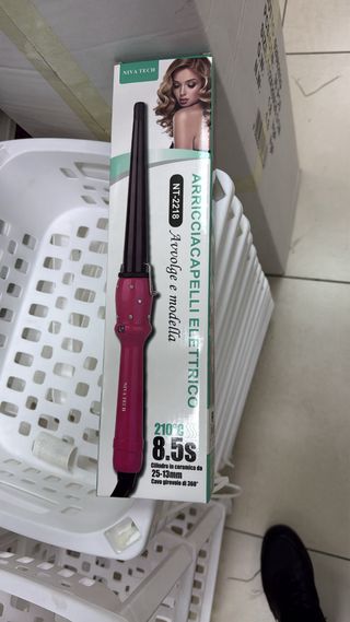 Arricciacapelli elettrico con finitura rosa e dettagli scintillanti. Il cilindro è in ceramica e ha una forma conica. - Cilindro in ceramica da 25-13mm. - Cavo girevole a 360°. - Temperatura 210°C. - Tempo di riscaldamento 8.5s.