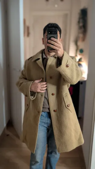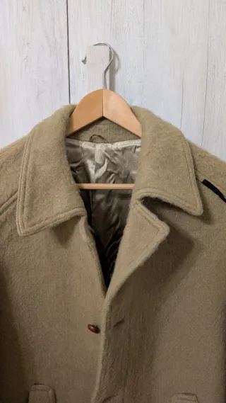Raro cappotto vintage Dolomiten Sportswear, un pezzo autentico dell'artigianato tessile italiano ispirato alla tradizione tirolese. Si tratta di un pregiato Rehbock-Loden, una variante di loden particolarmente morbida e lussuosa grazie all'alta percentuale di Mohair. Colore: Cammello/Beige caldo, un classico intramontabile. Tessuto: Texture "shaggy" (pelo visibile) tipica dei capi di alta gamma in Mohair. Dettagli: Bottoni in stile Loden, finiture sartoriali e fodera interna divisa: raso nella parte superiore per facilitare la vestibilità e lana a quadri (check) nella parte inferiore per il massimo calore.
