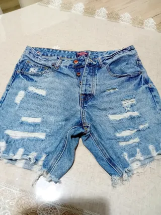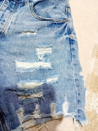 Pantaloncini in denim con un design strappato e un lavaggio effetto stone washed. Presentano una chiusura con bottoni. - Vita alta - Tasche anteriori e posteriori - Orlo sfrangiato