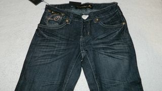 Jeans da donna con ricamo In Love With Denim. - Decorazione ricamata sulla cintura. - Etichetta interna CECILIA CLASSICS con taglia 38. - Bottone decorato sul davanti. codice 023