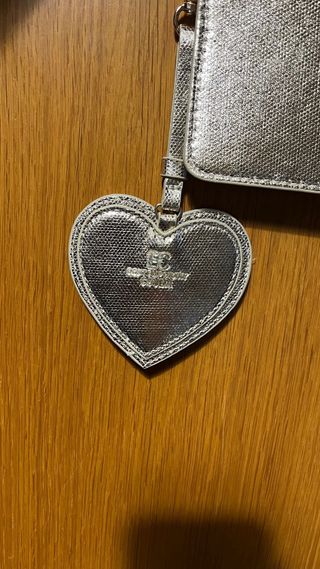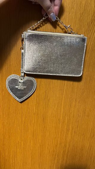 Mini trousse con un elegante ciondolo a forma di cuore. - Finitura metallica. - Ciondolo a forma di cuore applicato. - Catena dorata per il trasporto.