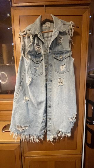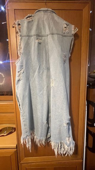 Giacca in denim da uomo, senza maniche e con un look grintoso. - Design strappato e sfrangiato. - Chiusura con bottoni. - Tasche sul petto.