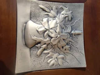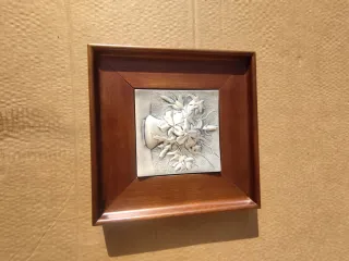 Elegante portagioie con cornice in legno e decorazione in metallo. - Cornice in legno scuro. - Pannello centrale con bassorilievo floreale. - Design classico e raffinato.