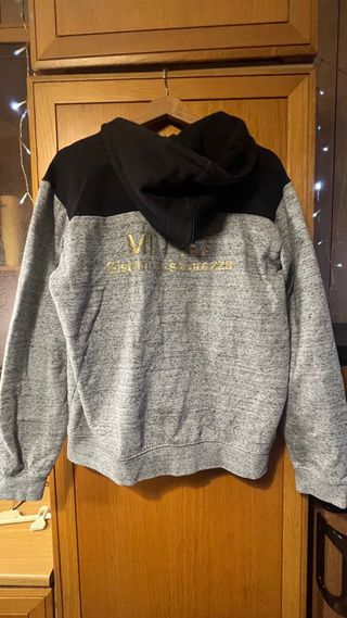 Felpa con cappuccio e zip frontale. - Tessuto mélange grigio. - Dettagli in nero. - Logo dorato sul petto.