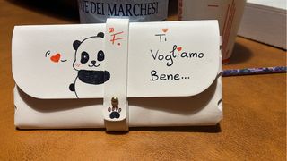 Porta occhiali con un simpatico disegno di un panda e una scritta fatte a mano. - Disegno di un panda con cuori. - Scritta Ti Vogliamo Bene.... - Dettaglio di una zampa di panda sul cinturino. - iniziale - dedica sul retro. è possibile ricreare qualsiasi tipo di scritta, è piccolo disegno, se interessati scrivetemi in privato grazie mille ☺️