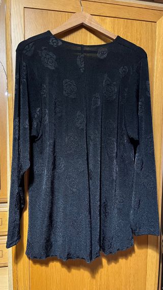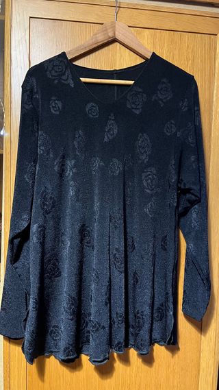 Maglia a maniche lunghe con fantasia floreale. - Tessuto morbido e leggero. - Scollo a V. - Orlo ondulato.