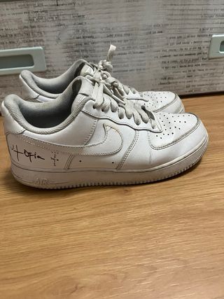 Scarpe Nike Air Force 1 personalizzate con il nome Utopia e Travis Scott. Design unico. Colore bianco.