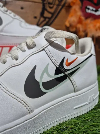 Scarpe Nike Air Force 1 con dettagli arancioni. Design classico. Combinazione di colori accattivante. Suola in gomma marrone.