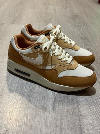 Scarpe sportive Nike Air Max 1 in tonalità marrone e beige. Un classico reinventato con un design moderno e comodo. Design iconico Air Max 1. Combinazione di colori marrone e beige. Dettagli del marchio visibili.