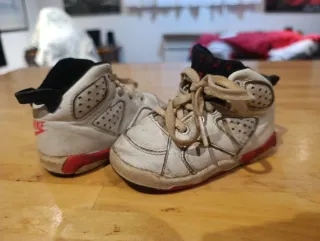 Scarpe da ginnastica Nike Jordan in stile retrò, originali, devono essere degli anni '80 massimo del 1990. Non hanno nulla di rotto. Una reliquia da collezione, sono come mostrato nelle foto, taglia 20 EUR, US 4.5, UK 4, 10.5 cm. Design iconico. Combinazione di colori bianco, rosso e nero.