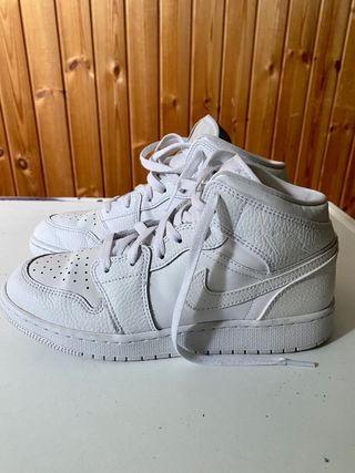 Vendo un paio di sneakers Nike Air Jordan 1 Mid, colore bianco. Sono in buone condizioni, presentano qualche piccolo segno di usura. - Modello Mid - Pelle bianca infossate una volta