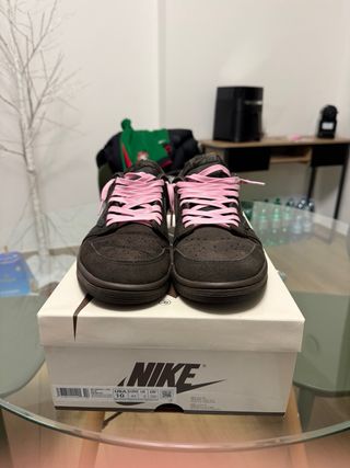 Scarpe Jordan 1 Low Travis Scott in velluto marrone con lacci rosa. - Tomaia in camoscio marrone. - Dettagli in velluto. - Lacci rosa inclusi. box e lacci di ricambio usate solo una volta