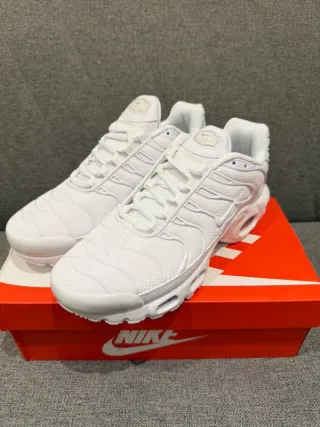 Scarpe Nike Air Max Plus TN in taglia 38, colore bianco. Utilizza inpost. - Design iconico con linee ondulate. - Unità Air visibile sulla suola. - Chiusura con lacci. - Logo Nike sulla linguetta e sul lato.