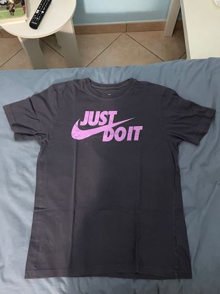 T-shirt (M, 168 cm), Nike grigia a maniche corte, con una grande stampa verticale dello slogan "JUST DO IT" i cui contorni sono realizzati con i colori dell'arcobaleno.
