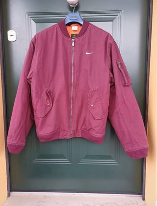 Giacca bomber Nike dal colore bordeaux intenso, perfetta per la stagione invernale. Presenta un design classico con fodera arancione. - Logo Nike ricamato sul petto. - Tasche laterali con chiusura a bottone. - Tasca con zip sulla manica sinistra. - Polsini e fondo elasticizzati.