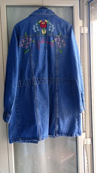 Giacca in denim da donna con un design unico e colorato. Perfetta per aggiungere un tocco di stile al tuo guardaroba. - Ricami floreali e di insetti. - Chiusura con bottoni. - Tasche frontali con patta. - Dettagli borchiati sui polsini.