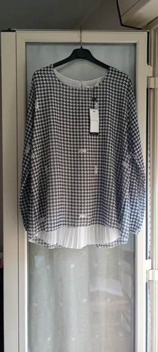 Elegante blusa con fantasia pied de poule. Il capo presenta un design moderno e versatile. - Fantasia pied de poule. - Orlo con pieghe. - Maniche lunghe.