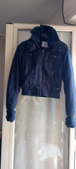 Elegante giubbotto blu con dettagli in pelliccia. - Chiusura con zip frontale. - Tasche con bottoni. - Polsini e fondo elasticizzati.