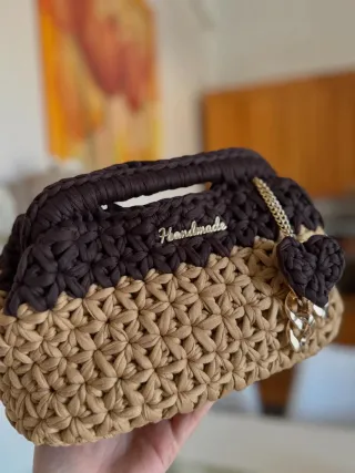 Elegante clutch realizzata a mano, perfetta per ogni occasione. Un accessorio unico che aggiunge un tocco di stile. - Design bicolore con lavorazione a crochet. - Dettaglio Handmade dorato. - Charm a forma di cuore pendente.