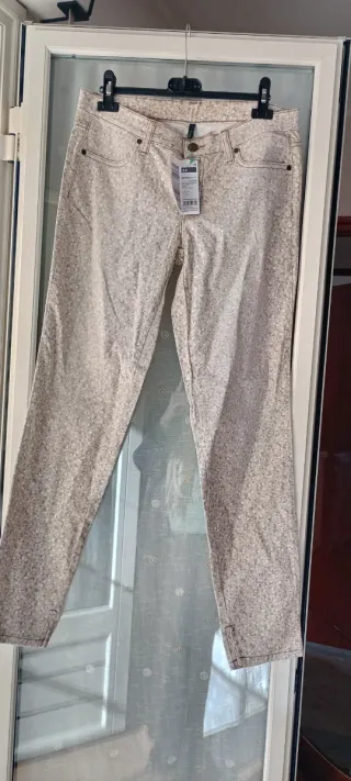 Pantaloni con una delicata fantasia floreale su fondo beige. Un capo versatile per diversi outfit. - Fantasia floreale . - Dettagli con cuciture a contrasto.