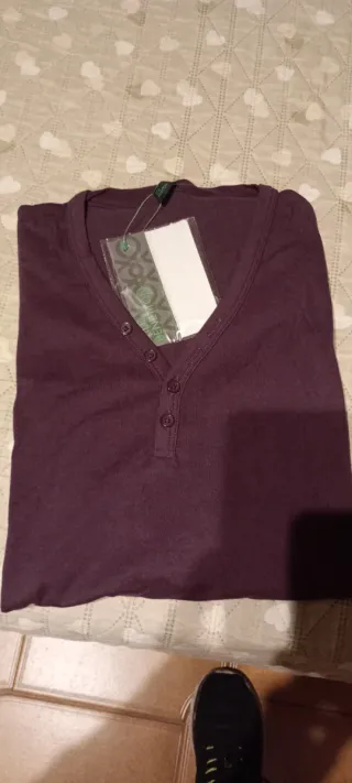 Maglietta da uomo a maniche lunghe, con una tonalità di viola intenso. Presenta una chiusura a bottoni sul colletto.