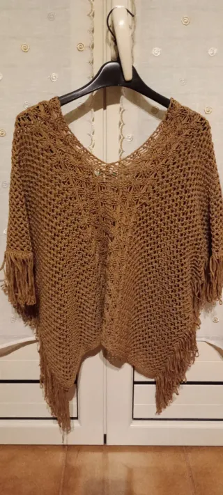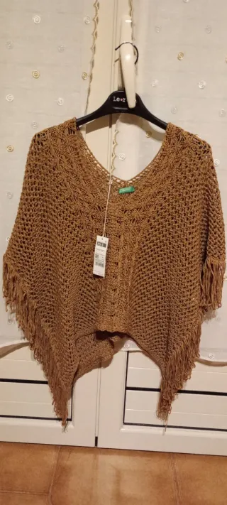 Elegante poncho United Colors of Benetton. - Tessuto lavorato all'uncinetto. - Design con frange. - Scollo a V.