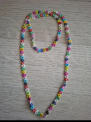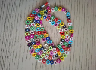 Deliziosa collana realizzata con tanti piccoli fiori colorati. - Design unico e vivace. - Chiusura a moschettone dorata.