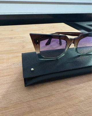 Occhiali da sole dal design unico. Interamente lavorato a mano. Lastra e lenti con antiriflesso interno.Modello unico! Vendo solo perchè per me il calibro è troppo grande! Indossato un’ora. - Montatura con sfumature verdi e viola. - Lenti con gradiente viola/rosa.