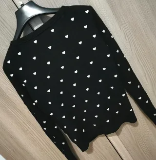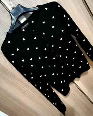 Cardigan in misto lana con un grazioso motivo di cuori bianchi su sfondo nero. - Scollo rotondo. - Chiusura con bottoni. - Maniche lunghe. -In ottimo stato pari al nuovo.