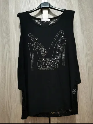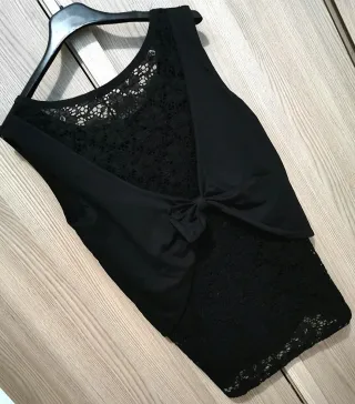 Elegante top nero con dettagli in pizzo. - Inserti in pizzo sulla schiena e sul fondo. - Fiocco decorativo - Design senza maniche. -Diseg o con borchiette sul davanti. -In ottimo stato pari al nuovo