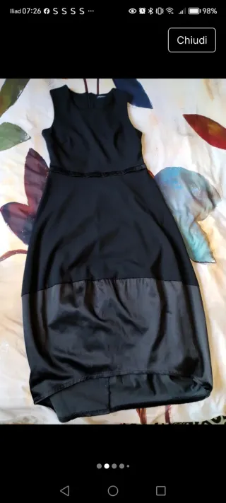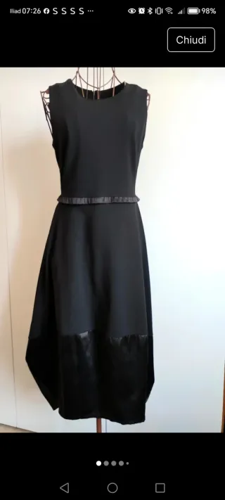 Elegante abito nero con dettagli in raso. - Scollo rotondo. - in vita nastro in raso. - Gonna ampiaa sacco con inserto in raso sul fondo, più lungo dietro. -Cerniera di chiusura sulla schiena. -in ottimo stato pari al nuovo particolari e misure in foto, taglia unica veste massimo fino a una taglia 46 italiana.