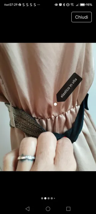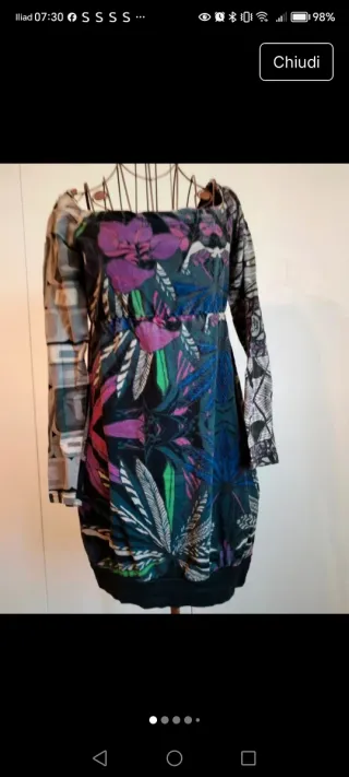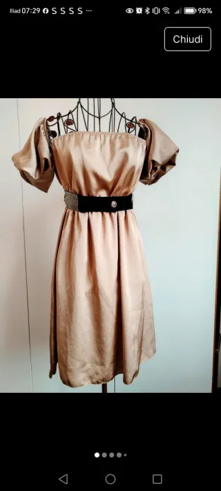 Elegante abito color beige dorato, perfetto per occasioni speciali. - Scollo quadrato.Abito Desigual con un design vivace e colorato. - Maniche lunghe. - Fantasia floreale e geometrica. - Scollo rotondo. - Maniche a sbuffo. - Cintura nera con dettagli luminosi. -Nuovo mai indossato particolari e misure in foto
